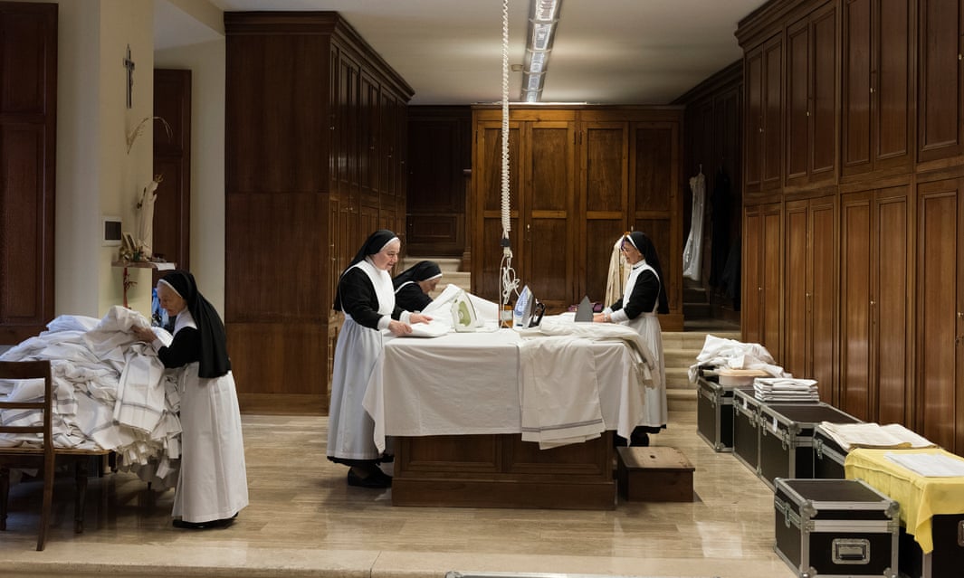 In the Sala Regia, a vast antechamber to the Sistine Chapel, workers are packing portraits of 19th-century popes into removal crates after an exhibition. Just off this room is the apostolic sacristy where Father Pavel Benedik, a taciturn Slovakian priest, is fiddling with his smartphone. He is the custodian here, and calm prevails. In an hour, the phone rings once. The room is lined with polished wardrobes, a hive of numbered wooden doors in which every item has its place, and every place has a label. Vestments are stowed by size (Pope Francis takes a 3, the most popular) and the drawers are taped with old-fashioned embossed strips: “X IL PAPA [for the pope]”, “VIMPE STOLE [shawls, stoles]”.